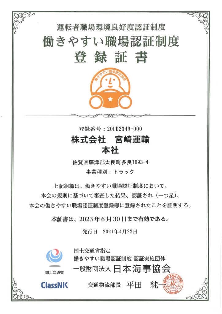 昨年、働きやすい職場認証制度(一つ星)を取得しました。